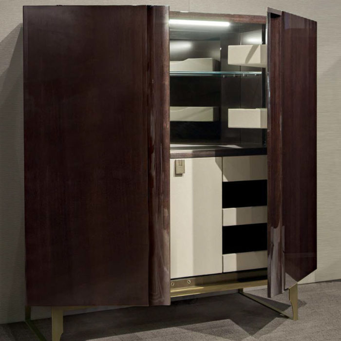 Bar très fonctionnelle de design contemporain en placage de bois précieux.